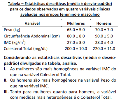 Pesquisadores da área da saúde cardiovascular pretendem descobrir se um tratamento para diminuir o nível de colesterol no sangue sofre influência do gênero do paciente. Para isso, selecionaram um grupo de voluntários de ambos os sexos e coletaram dados sobre as variáveis clínicas relacionadas na tabela abaixo.