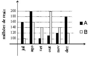O gráfico abaixo mostra o faturamento das empresas Ae B no segundo semestre de 2005. Com base nesse gráfico, podemos afirmar que o faturamento da empresa B: