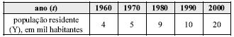 Um município ocupa uma área de 165 km 2 desde 1940. A tabela acima mostra a evolução temporal da população residente (em mil habitantes) nesse município obtido por levantamentos censitários. Com base nessas informações, julgue os itens a seguir.