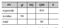 O quadro acima mostra parte de uma tabela de análise de variância (ANOVA), que resultou da regressão linear simples do tempo que um usuário permanece conectado à Internet 3G Y, em minutos sobre a renda X declarada por esse usuário. Os dados utilizados nesse ajuste pelo método de mínimos quadrados ordinários foram selecionados por amostragem aleatória simples de um cadastro de usuários. Com base nessas informações e no quadro apresentado, julgue os itens seguintes acerca dos conceitos de análise de regressão, correlação e amostragem.