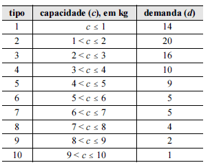 Considere que determinado fabricante classifique suas embalagens de acordo com a capacidade de armazenamento unitário (c), em kg, de determinado produto por exemplo, a embalagem do tipo 10 permite armazenar mais de 9 e até 10 kg do produto. Com base nessas informações e na tabela acima, que mostra a distribuição dos dez tipos de embalagens e a demanda observada em março de 2011 para cada tipo, julgue os itens que se seguem.