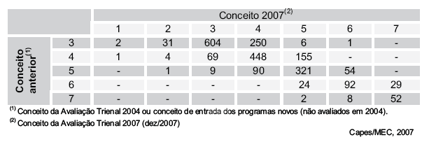 Responda às questões de nos 50 e 51 com base nos resultados das Avaliações Trienais de 2004 e 2007 realizadas pela Capes nos cursos de pós-graduação do país apresentados na tabela a seguir.