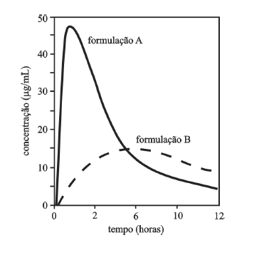 Considerando que o gráfico precedente apresenta a concentração plasmática de um fármaco em função do tempo de administração a partir de duas formulações farmacêuticas A e B diferentes, julgue os itens a seguir.