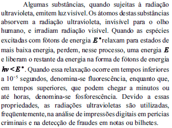 De acordo com o texto, a maior diferença entre os conceitos fluorescência e fosforescência está relacionada ao tempo entre a absorção da energia e a emissão do fóton.