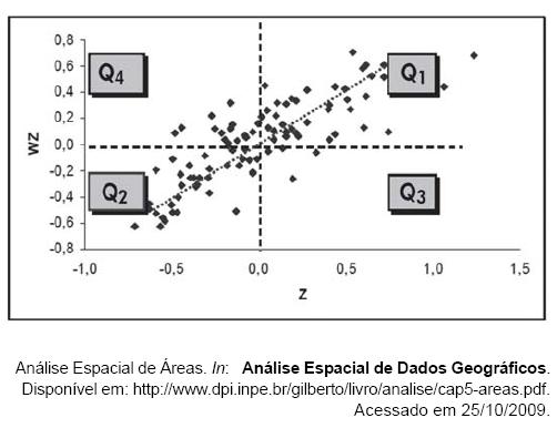 Q3 (valores positivos, médias negativas) e Q4 (valores negativos, médias positivas) indicam pontos de associação espacial positiva, no sentido de que uma localização possui vizinhos com valores semelhantes.