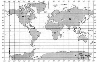 O Sistema de Coordenadas Geográficas é utilizado para a localização de pontos fixos nos mapas. Cada lugar ou ponto da superfície terrestre corresponde a uma coordenada geográfica. Considerando esse sistema e a figura apresentada, assinale a opção correta.