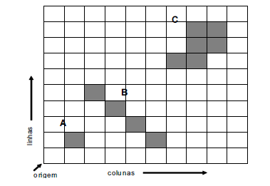 A figura acima mostra um exemplo de representação matricial de três objetos designados pelas letras A, B e C. O modelo matricial assemelha-se a um tabuleiro de xadrez ou algo como uma matriz regular de células. Julgue os itens seguintes, relativos a esse modelo de representação de dados.