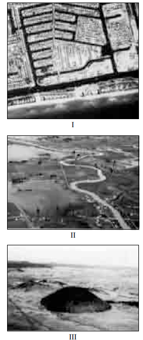 As figuras I, II e III acima correspondem a fotografias aéreas que foram obtidas em diferentes regiões dos Estados Unidos da América e da Nova Zelândia e mostram feições do terreno relacionadas com área urbana, planície de inundação e vulcanismo respectivamente. Julgue os itens que se seguem, relativos a essas fotografias.