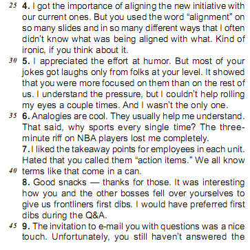 "The fact that you spent the first 12 minutes making the rest of us wait for our bosses to show up?"(lines 12-14) – boast.