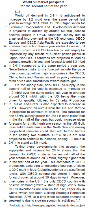 In the fragments of Text I World oil demand in 2H14 is anticipated to increase (lines 2-3), OECD (Organisation for Economic Co-operation and Development) demand is projected to decline (lines 5-6), oil demand growth in OECD Asia Pacific will largely be impacted (lines 11-12), Production in Russia and Brazil is also expected to increase (lines 24-25) the boldfaced verb forms indicate
