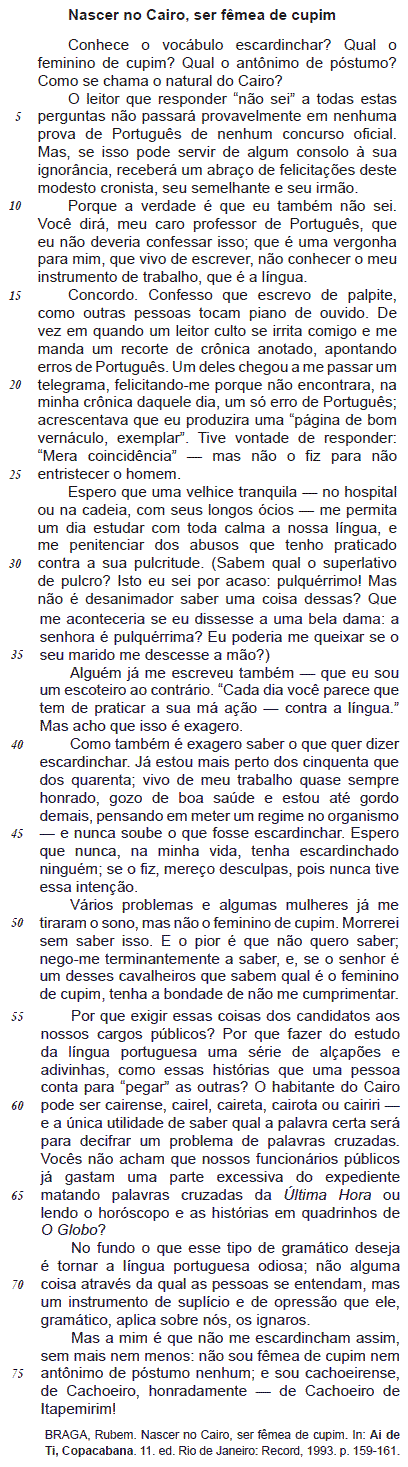 O autor do texto, ao discutir sua relação com a língua, afirma: De vez em quando um leitor culto se irrita comigo e me manda um recorte de crônica anotado, apontando erros de Português (l. 16-19).