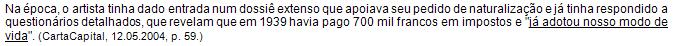 Na época, o artista tinha dado entrada num dossiê extenso que apoiava seu pedido de naturalização e já tinha respondido a questionários detalhados, que revelam que em 1939 havia pago 700 mil francos em impostos e já tinha adotado nosso modo de vida.