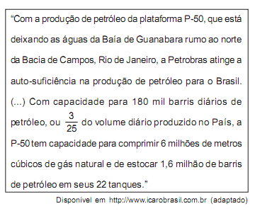 De acordo com as informações do texto acima, o volume diário de petróleo produzido no País, em milhares de barris, é de: