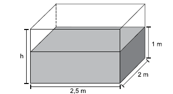 De um reservatório com formato de paralelepípedo reto retângulo, totalmente cheio, foram retirados 3 m³ de água. Após a retirada, o nível da água restante no reservatório ficou com altura igual a 1 m, conforme mostra a figura.