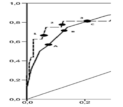 Considere hipoteticamente que um médico cardiologista está desenvolvendo um novo marcador sérico para diagnóstico de insuficiência cardíaca (IC), chamado cardio-hidrolipina, um elemento dosado de forma quantitativa. Nas fases finais de análise estatística dos estudos clínicos relacionados ao seu marcador, ele resolveu comparar a acurácia da cardio-hidrolipina com o marcador habitualmente utilizado (BNP) no diagnóstico de IC, utilizando como padrão ouro para ambos o diagnóstico clínico concordante de dois cardiologistas experientes e independentes. Além disso, queria comparar os diferentes possíveis pontos de corte para determinar o exame positivo e suas respectivas sensibilidade e especificidade. Para uma análise mais complexa, o médico construiu as curvas ROC para ambos os testes diagnósticos, que se encontram plotadas no gráfico apresentado, sendo que a linha tracejada representa o desempenho da cardio-hidrolipina, e a linha contínua representa o desempenho do BNP. Algumas informações foram propositalmente ocultadas. Note que o ponto C e o ponto 3 estão sobrepostos. Acerca da interpretação desse gráfico, julgue os itens a seguir.
