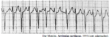 Considere ainda que o paciente em questão, em outro dia, tenha dado entrada no pronto-socorro com quadro de edema agudo de pulmão e, durante a monitorização eletrocardiográfica, tenha sido realizado o registro em papel (velocidade do papel 25 mm/s, calibração 1 cm = 1 mV, derivação de monitor MC1) apresentado abaixo. Nessa situação, é correto afirmar que a arritmia observada é a taquicardia paroxística supraventricular com reentrada nodal.