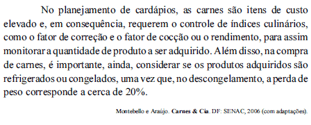 Se, para servir a 125 clientes, 25 kg de carne refrigerada, limpa e cortada forem utilizados em uma preparação cujo método de cocção é o do calor seco, a quantidade de produto pronto não será suficiente para servir 200 g de prato proteico a cada cliente.