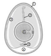 A calaza, identificada com os números 2 e 3, constitui a estrutura que mantém a gema no centro do ovo. Em todos os tipos de preparação, ela deve ser removida, pois nela se concentram as propriedades antigênicas, resistentes à desnaturação térmica da ovoalbumina.