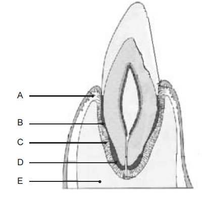 A letra B corresponde ao cemento celular.