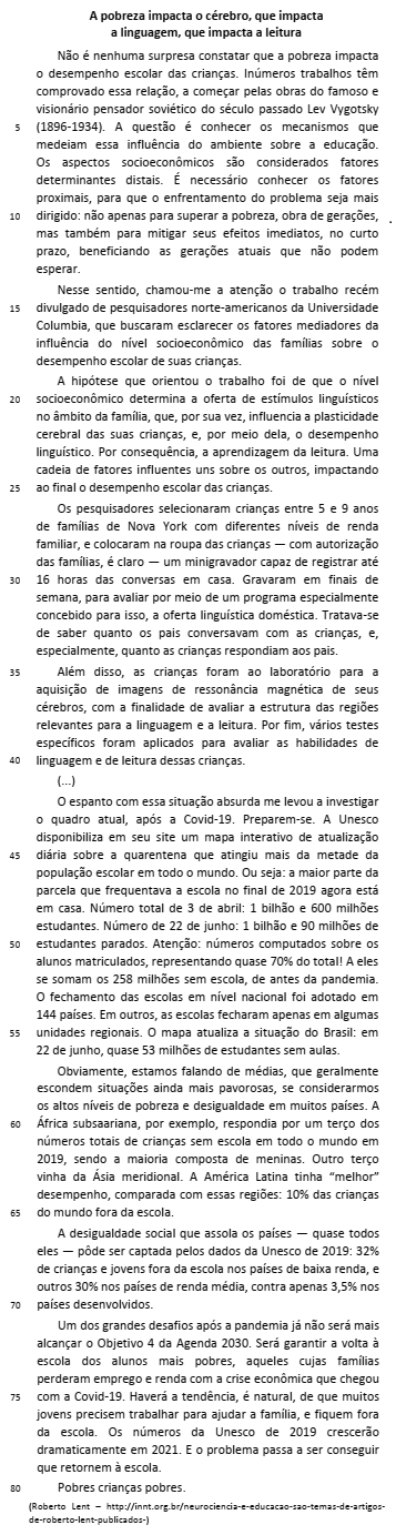 II. O argumento a partir de dados estatísticos, como ocorre em: O fechamento das escolas em nível nacional foi adotado em 144 países. Em outros, as escolas fecharam apenas em algumas unidades regionais. O mapa atualiza a situação do Brasil: em 22 de junho, quase 53 milhões de estudantes sem aulas. (L. 53-56) corrobora a gravidade das situações articuladas sobre o tema.