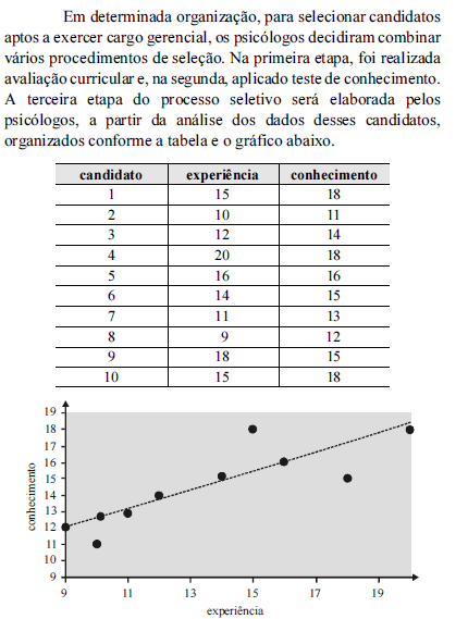 É possível afirmar que a correlação entre experiência e conhecimento, embora imperfeita, é elevada, significando que um mesmo candidato que obteve escore alto em experiência, também obteve alto escore em conhecimento, e vice-versa.