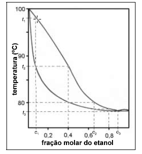 A mistura de álcool e água apresenta um forte desvio negativo da lei de Raoult, o que é evidenciado pela formação de um ponto azeotrópico na composição c3.