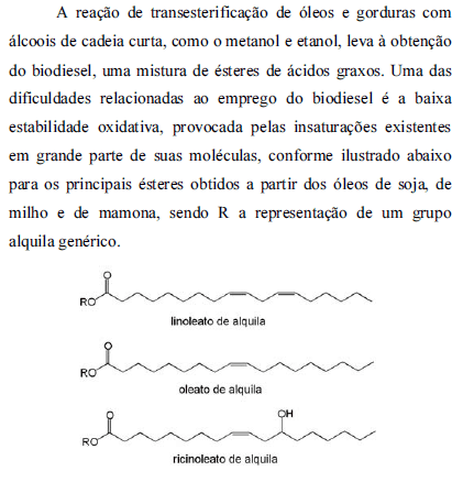 Com relação ao processo de obtenção do biodiesel e às reações de seus componentes, julgue os itens seguintes.
