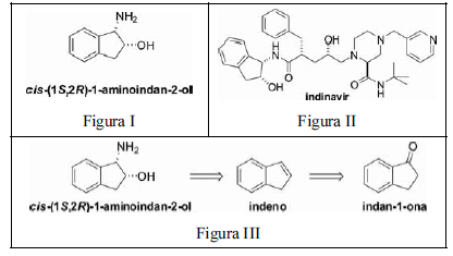 O cis-(1S,2R)-1-aminoindan-2-ol (figura I) é um importante bloco de construção para síntese do indinavir (figura II), um inibidor da protease viral do HIV. Na figura III está representada a análise retrossintética, em que o indeno participa como intermediário-chave da reação e a indan-1-ona, como matéria prima para a síntese de cis-(1S,2R)-aminoindanol. A partir dessas informações, julgue os itens que se seguem.