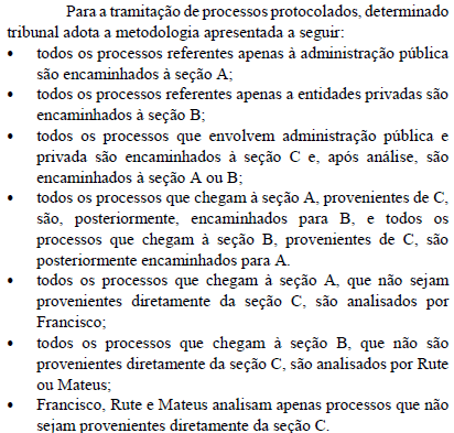 Se, de sete processos que chegarem à seção B, apenas dois deles forem encaminhados diretamente pela seção C, então a quantidade de formas distintas de escolha do servidor (Francisco, Mateus ou Rute) que analisará esses processos será superior a 15.