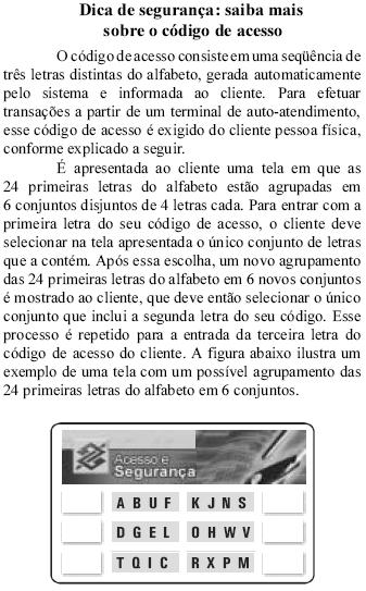 Suponha que uma pessoa observe atentamente um cliente do BB enquanto este digita o seu código de acesso. Suponha ainda que ela observe que os três conjuntos de letras em que aparecem o código do cliente são disjuntos e, tendo memorizado esses três conjuntos de letras, na ordem em que foram escolhidos, faça um palpite de qual seria o código de acesso do cliente. Nessas condições, a probabilidade de que o palpite esteja certo é inferior a 0,02.