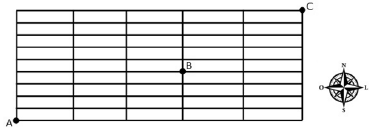 Considere que a figura a seguir que consiste de um retângulo maior subdividido em 45 retângulos menores, no qual estão destacados os pontos A, B e C; ao lado do retângulo maior estão indicadas as direções norte (N), sul (S), leste (L) e oeste (O) representa um mapa, fora de escala, de parte de uma cidade onde será realizada uma pesquisa domiciliar.