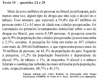 Os dados epidemiológicos apontados na pesquisa descrita no texto IV permitem concluir que o uso de drogas lícitas é um grave problema, o que justifica uma abordagem específica acerca dessa questão. No que se refere a esse assunto, julgue os itens abaixo.