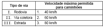 Na tabela abaixo, à esquerda está indicado o tipo de via. À direita está indicada a velocidade máxima nela permitida para caminhões, nos casos de não existir a sinalização regulamentadora de velocidade máxima.